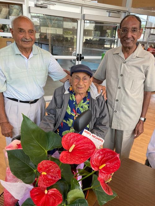 Daljit Singh Dhillon, a long time member of the society with Manjit Dhillon on left. Sucha Claire on the right at his 100th Birthday in August 2023.
