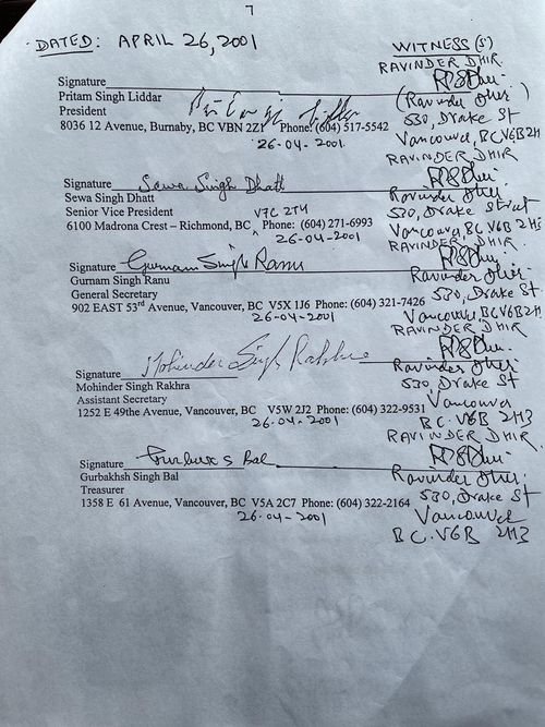Standing Left to Right: (All Directors) Malkiat Singh Dhaliwal, Hardial Singh Gill, Rughbir Singh Uppal, Mohinder Singh Johal, Jarnail Singh Sahota, Ranjit Singh Shoker.